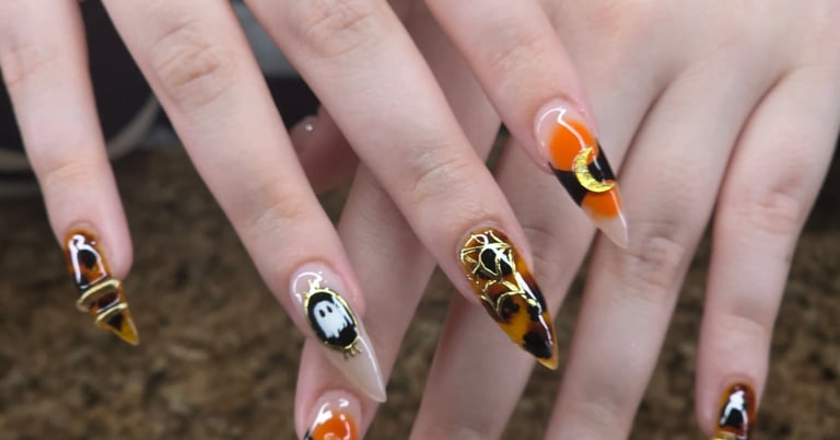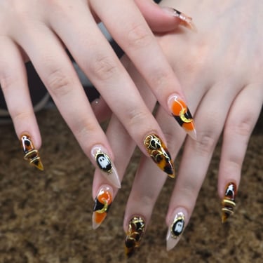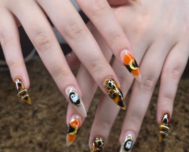 Full-set art including sculpted 3D, detailed hand-painted designs, characters, or high-concept styles. A full transformation.