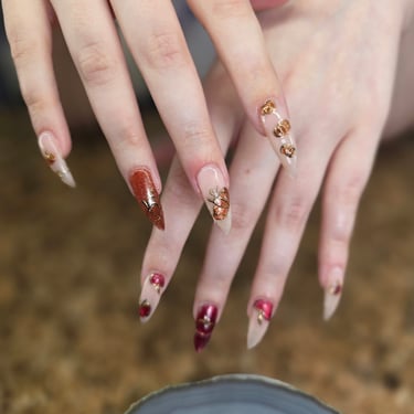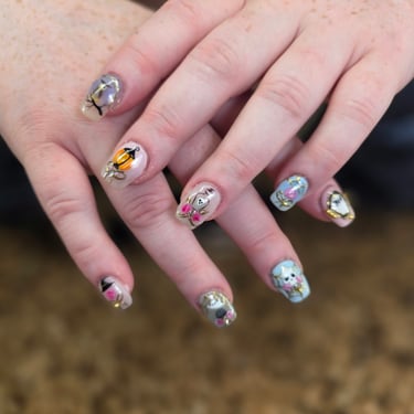 Mixed nail designs with added layers: gems, foil, swirls, textures. Includes everything in Basic Charm and more.